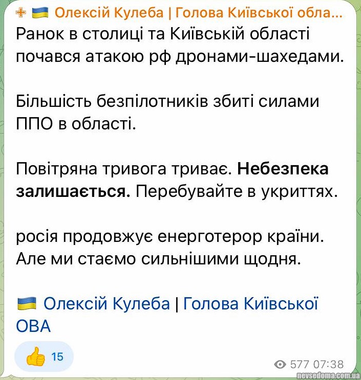 - Судячи з того, що пише голова Київської ОВА Кулеба, мопедами знову намагаються атакувати об'єкти енергетики.