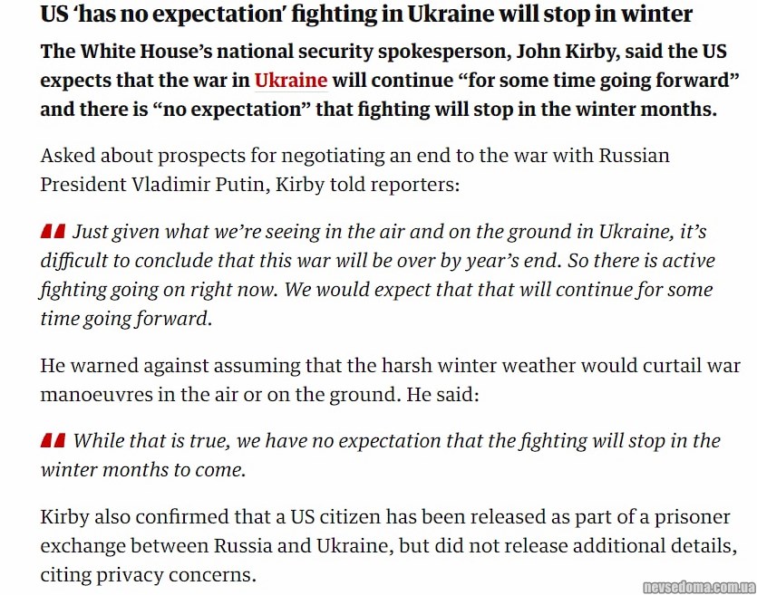 - Війна взимку не закінчиться. Представник Білого дому з національної безпеки Джон Кірбі заявив, що США очікують, що війна в Україні триватиме якийсь час у майбутньому, і немає жодних очікувань, що бойові дії припиняться в зимові місяці.
