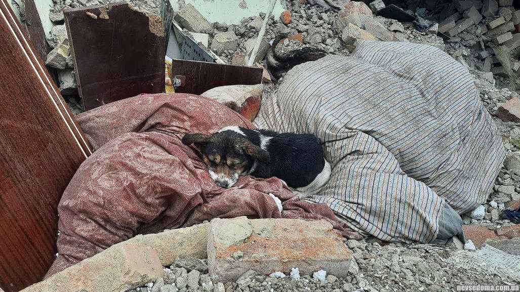 - Собака лежить на уламках будинку, зруйнованого російською ракетою.
