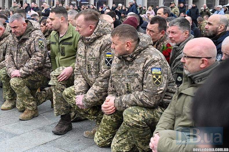 ▪️На одному коліні стоять міністр оборони О.Рєзніков, головнокомандувач ЗСУ В.Залужний та голова ГУР К.Буданов та вся військова еліта