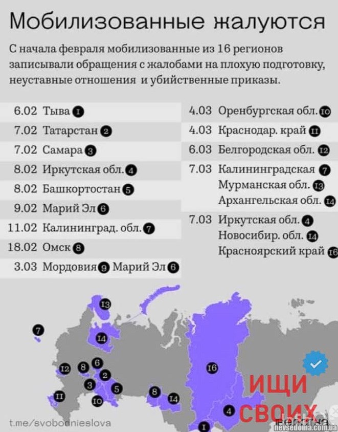 ▪️Тільки за лютий цього року мобіки із 16 регіонів РФ записали скарги. Вони погано оснащені, з них знущаються, посилають у лобові атаки на смерть і не дають достатньо БК. Багато хто вже записав мертвих