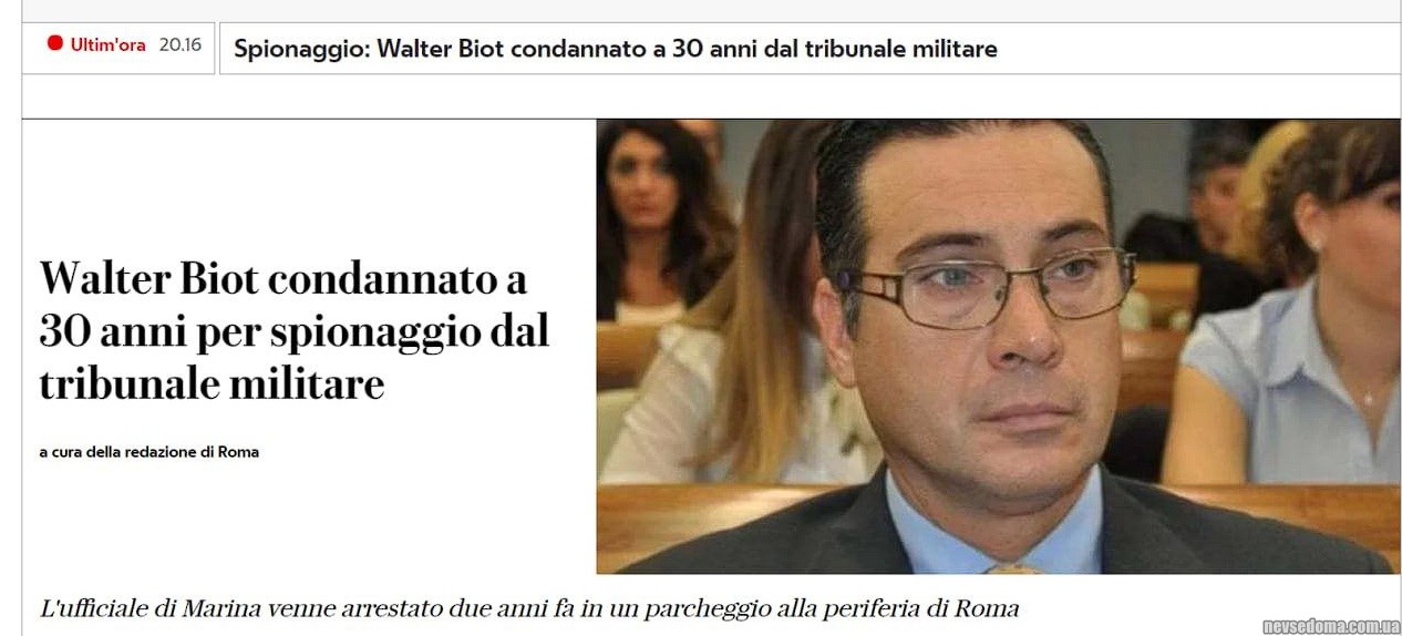 Військовий суд у Римі засудив (https://www.reuters.com/world/europe/italy-seeks-life-term-captain-accused-giving-russia-secrets-2023-03-09/) офіцера ВМС Італії Вальтера Біота до 30 років ув'язнення за шпигунство на користь росії. Він передав росіянам за винагороду секретні документи НАТО.