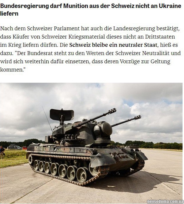 Видання пише (https://www.zeit.de/zustimmung?url=https%3A%2F%2Fwww.zeit.de%2Findex), що уряд Швейцарії заявив: покупці швейцарських військових матеріалів не можуть постачати їх до третіх країни, що у стані війни.