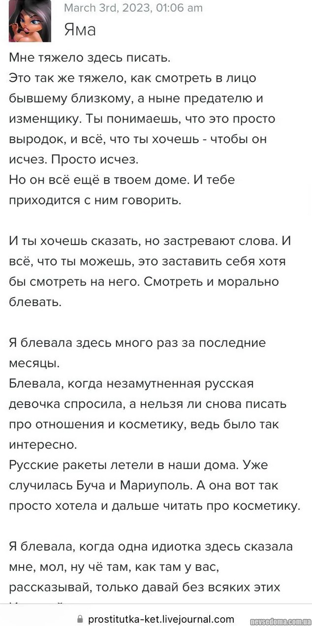 - Олди, пам'ятаєте, в ЖЖ (ще тому, "хорошому" ЖЖ нульових і початку двохтисячних) була блогерша prostitutka_ket? Так ось з початком війни виявилося, що замість Москви та Санкт-Петербурга у її оповіданнях були Київ та Одеса, вона українка