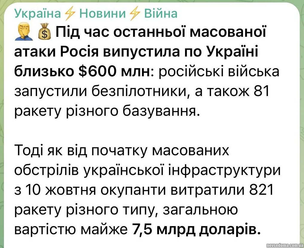 - 7,5 мільярдів доларів на лише бомбардування України пішло з бюджету Росії. 600 млн доларів коштувало лише вчорашнє бомбування.