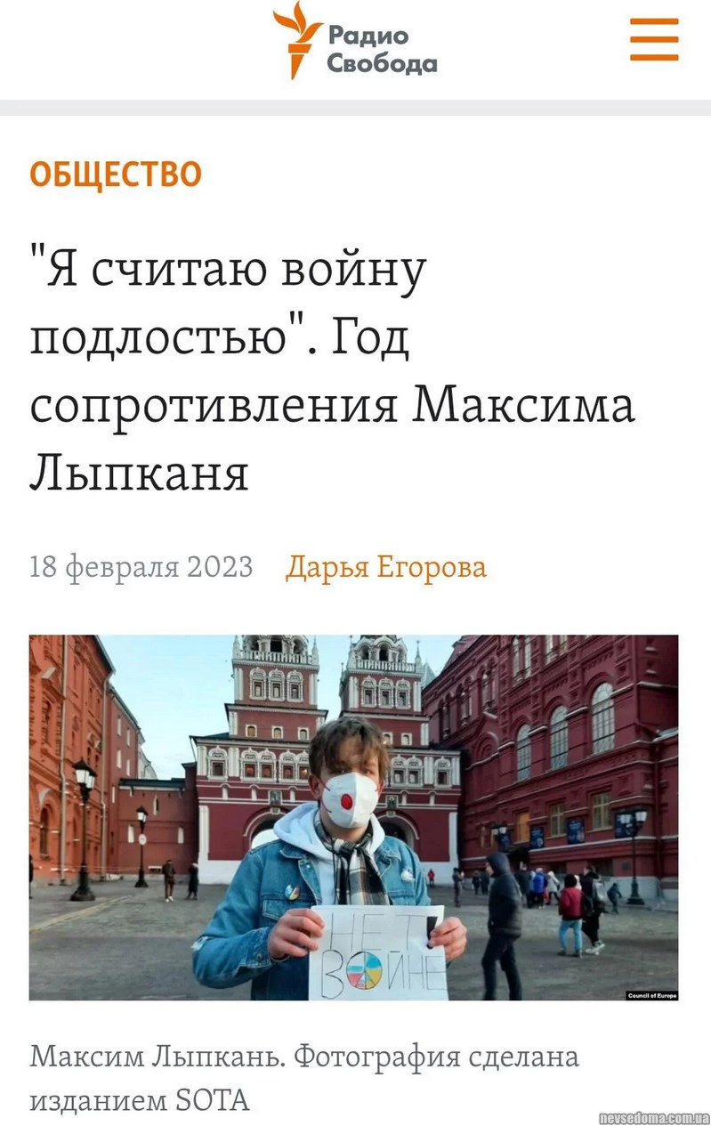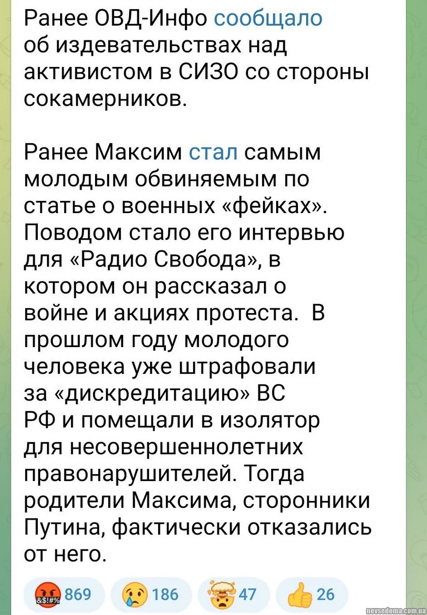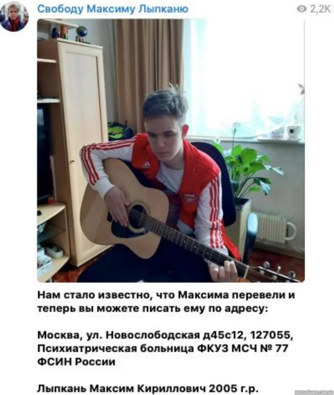 - Наймолодший обвинувачений за статтею про військових «фейки» 18-річного Максима Липканя переведено до психіатричної лікарні. Про це повідомили його прихильники у ТГ-каналі. "Астра"