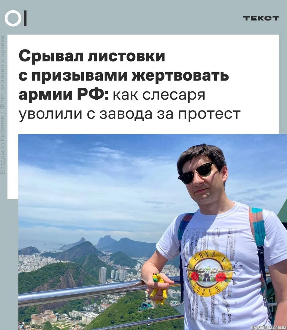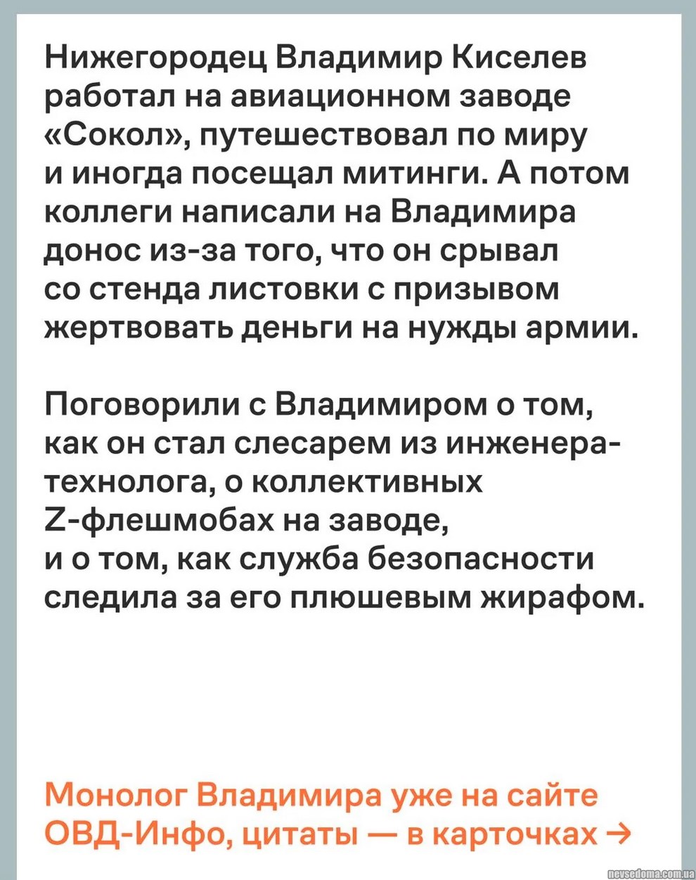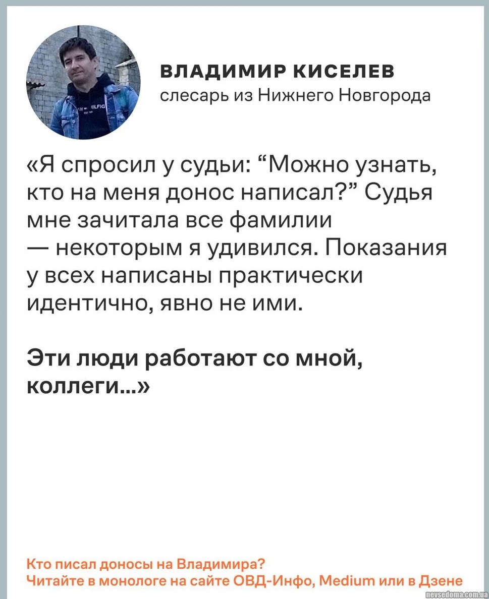 - ОВС-Інфо розповідає історію слюсаря з Нижнього Новгорода, якого звільнили за антивоєнні погляди. Зараз Володимир шукає нову роботу, але це буде непросто: минулий роботодавець вніс його до чорного списку, і тепер кожен відділ кадрів у місті може вважати його небажаною персоною.