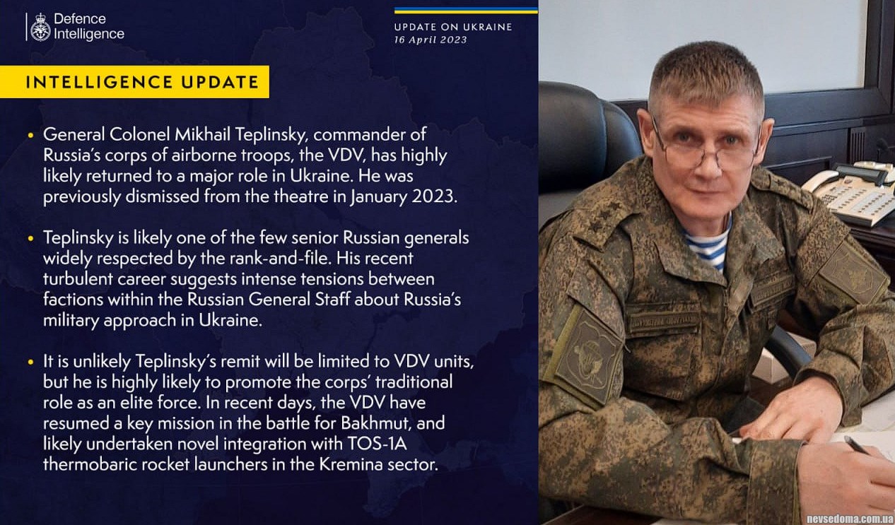- Повернувся до командування військами генерал-полковник Михайло Теплинський, якого зняли з посади командувача ПДВ у січні, — англійська розвідка.