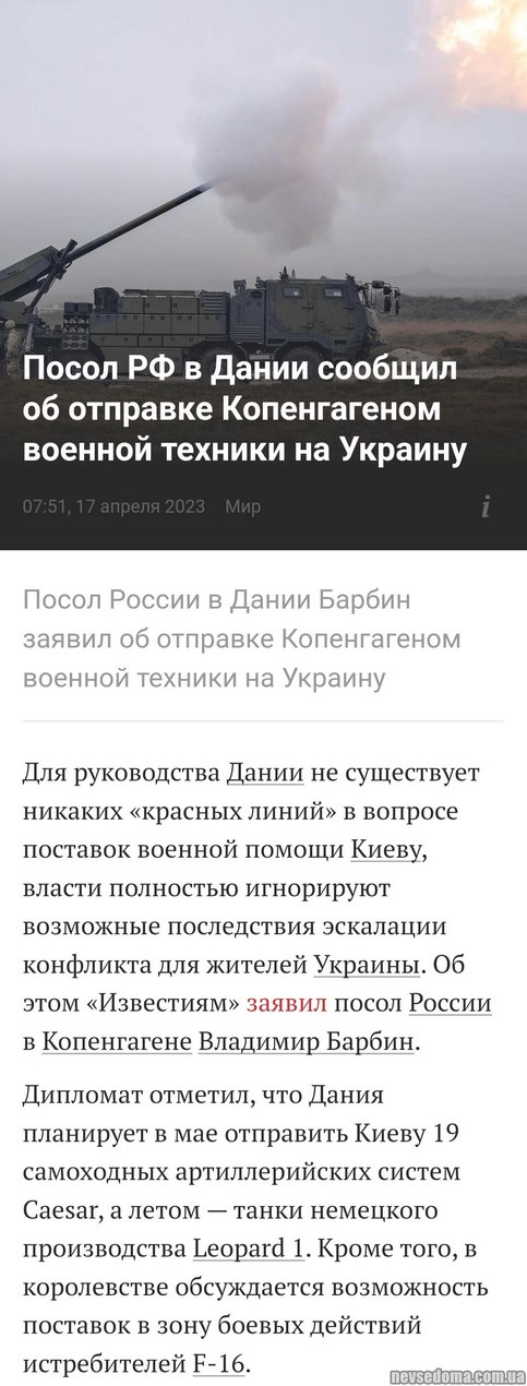 - Посол Росії в Данії Барбін заявив про відправку Копенгагеном військової техніки в Україну
