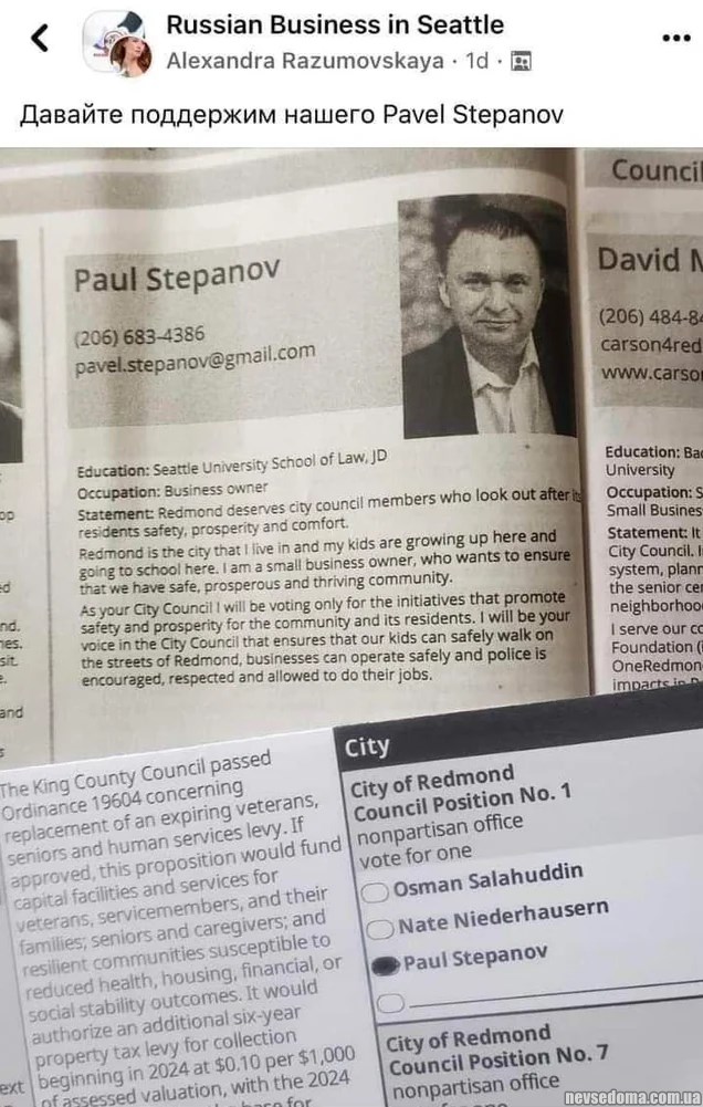У місті редмонд 1 серпня відбуватимуться вибори (поки праймериз) до місцевого city council. На цих виборах був помічений такий персонаж. Пост зі скріншоту у закритій групі ФБ, але факт чек зроблено, місцеві активісти відправили інформацію до місцевих ЗМІ, поки що без відповіді.