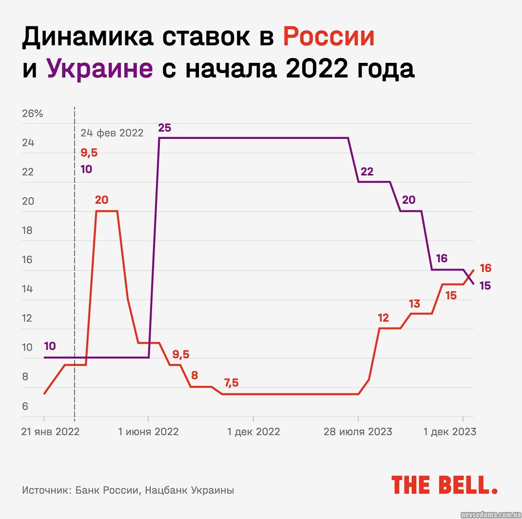 - Ось ще навздогін хороша картинка, як змінювалися облікові ставки в Україні та Росії в 2022-23.
