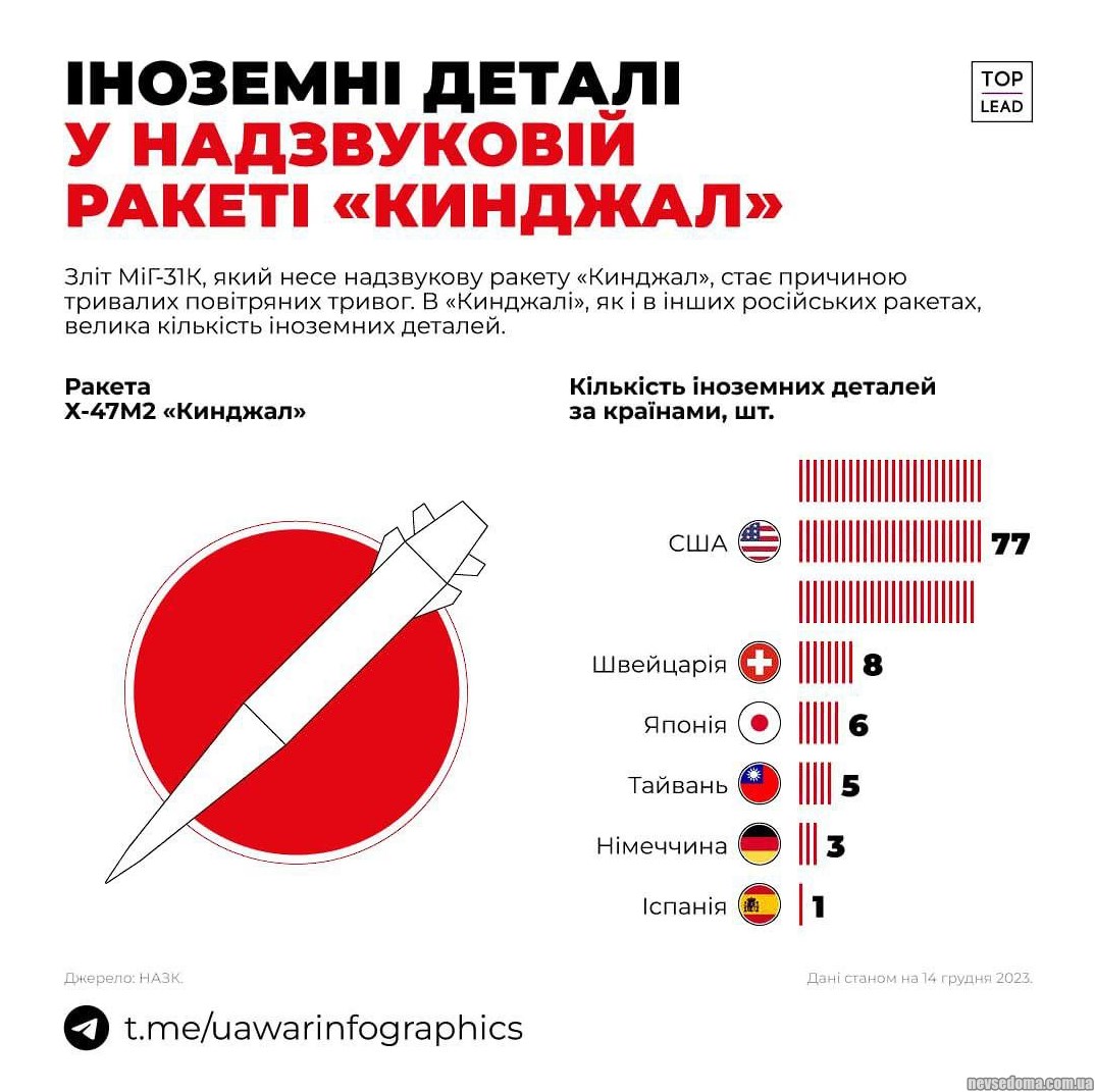 - У російській ракеті «Кинжал» було знайдено 77 американських деталей