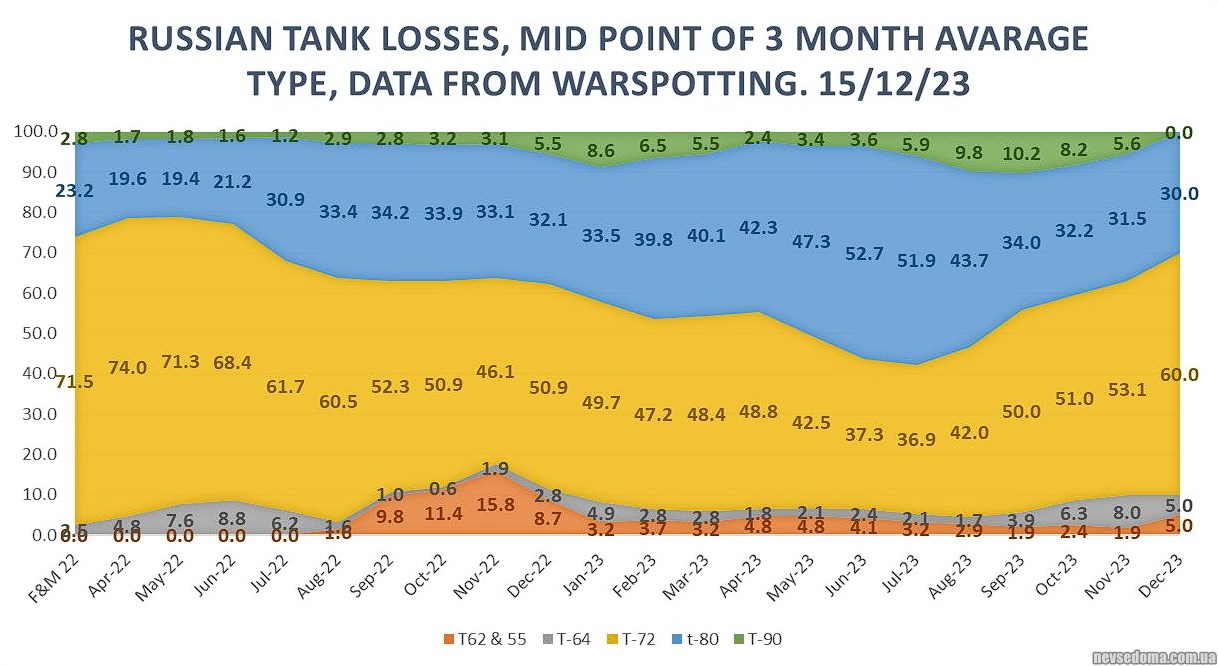 - OSInt-дослідник Річард Верекер, який займається підрахунком знищених російських танків за їхніми типами, зазначає, що кількість втрат Т-80 у відсотковому співвідношенні значно знизилася. На початку повномасштабної війни їх кількість коливалася на рівні 20% від загальної кількості, проте влітку 2023 року перевищила 50%. На поточний момент відсоток втрат Т-80 серед російських танків становить 30%. На його думку, така тенденція означає, що у росіян закінчуються Т-80, які можна легко відновити, так що нові поставки на фронт приходитимуть набагато повільніше. Верекер також вважає, що подібна тенденція помітна серед російських БМП - росіяни вичерпують запаси, які можна було легко відновити, серед втрат все частіше миготять бронетранспортери.