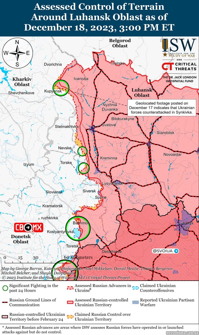 ▪️ВСУ відбили атаки російських військ на північному сході та сході від Куп'янська. Російські війська намагаються прорвати оборону України в районі Сіньківки та Серберянського лісництва на південь від Кремінної; проте українські сили у цих районах контратакують.