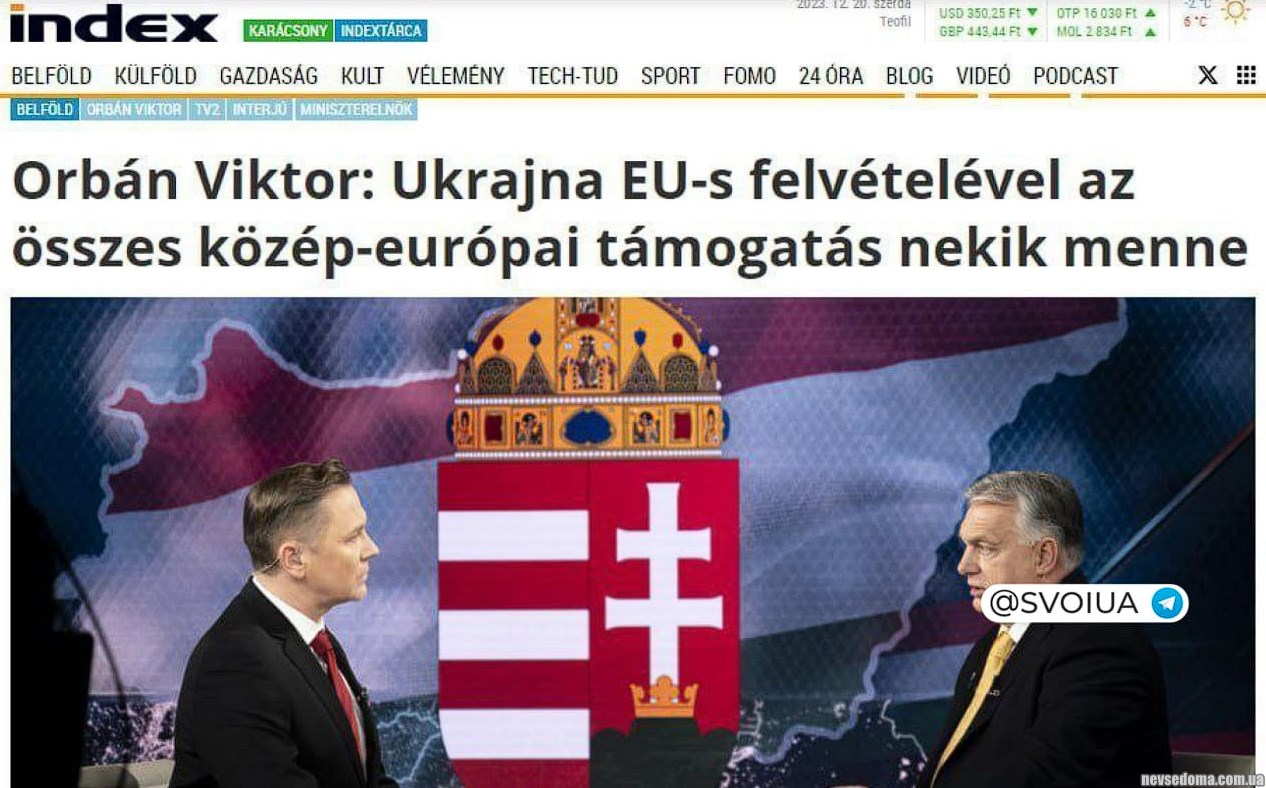- 🇭🇺 Прем'єр-міністр Угорщини Віктор Орбан висловлює побоювання щодо можливості того, що після приєднання України до Європейського союзу його країна втратить доступ до європейських фінансових ресурсів