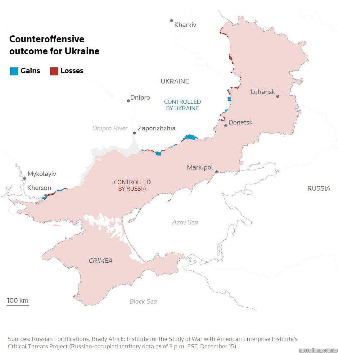 🔵 синій – успіхи настання ЗСУ; 🔴 червоний – оккупантів.