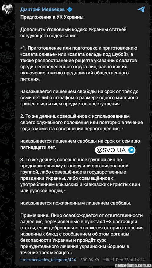 Він відзначився ідеєю саджати українців на 7 років за підготовку до приготування або розповсюдження рецептів відомих салатів зимового святкового застілля: "оселедець під шубою" та "олів'є". Медведєв запропонував внести відповідні виправлення до кримінального кодексу України.