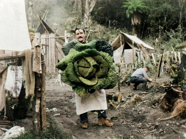 Повар держит гигантскую капусту в лагере в Wairarapa. Новая Зеландия, 1890 год.
