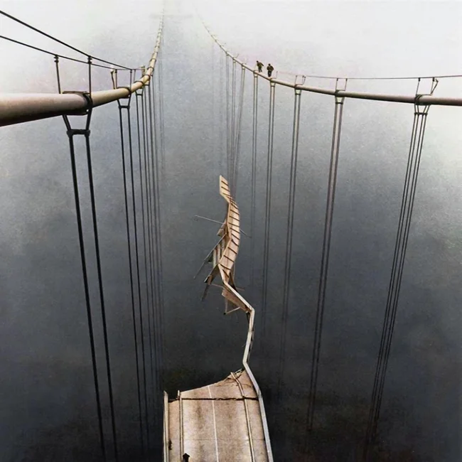 Обрушившийся в ноябре 1940 года висячий Такомский мост в Вашингтоне.