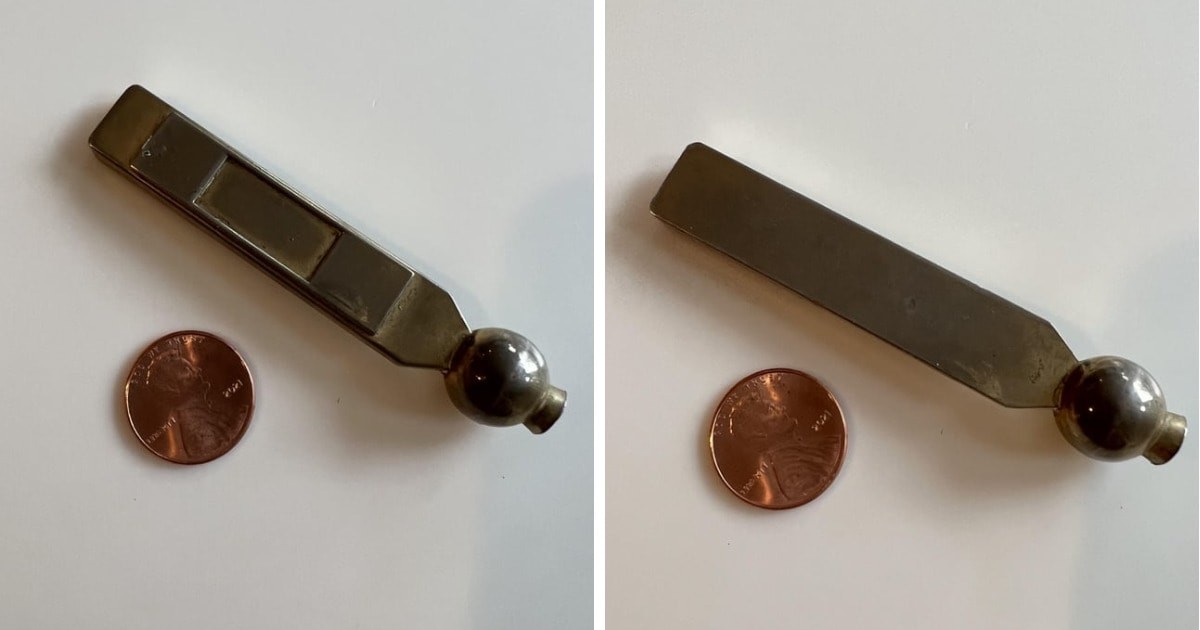 Выглядит точно так же, как штука на изначальном фото, за исключением магнита, на котором держится телефон. Видимо, либо его не видно, либо он потерян.