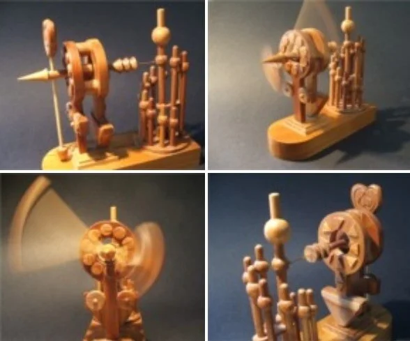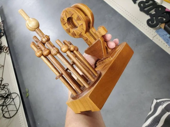 Найдено в комиссионном магазине. Сделано из дерева. Есть несколько веретён. Никаких движущихся частей