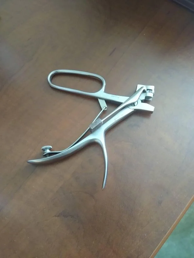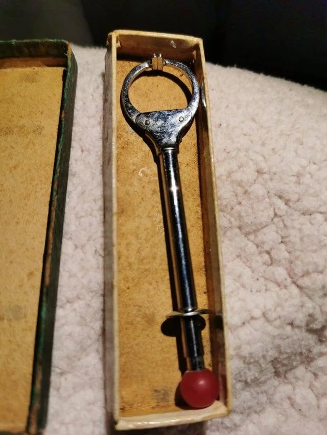 Найдено в старом кожаном (возможно, медицинском) чемодане. Длина 12 см, щипцы открываются при нажатии на красный верх