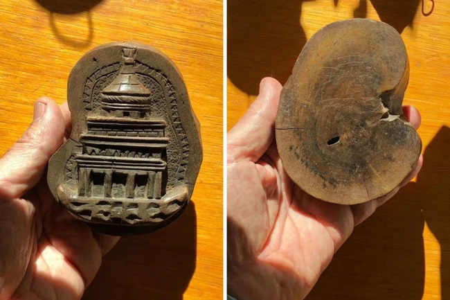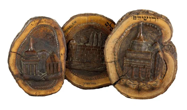 Определенно, резьба по оливковому дереву гробницы Авессалома в Иерусалиме; сзади на иврите написано «Иерусалим». Очень похоже на сувениры , датированные 1850-1920 годами.