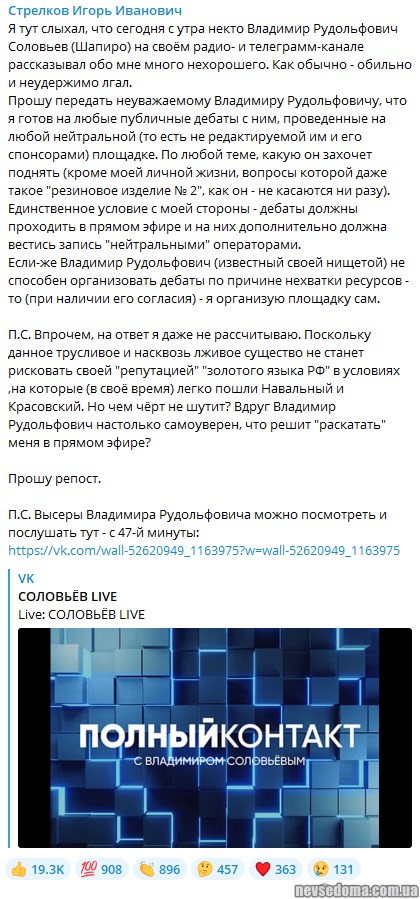 На днях, пропагандист Соловьев в прямом эфире заявил, что Стрелков "обосрался" и призвал его впредь не заниматься военными делами. Тот обиделся, назвал пропагандиста "резиновым изделием" и вызвал на дебаты.
