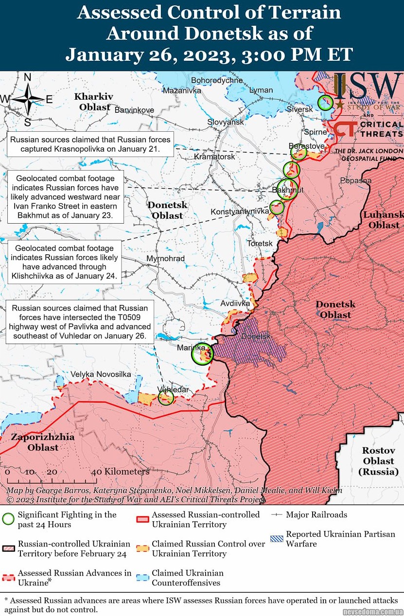 Как пишут в ISW, на Донецком направлении продолжаются активные бои. Россияне не смогли (https://www-understandingwar-org.translate.goog/backgrounder/russian-offensive-campaign-assessment-january-26-2023?_x_tr_sl=en&_x_tr_tl=uk&_x_tr_hl=uk&_x_tr_pto=sc) захватить Угледар. Кроме этого, ВСУ отбивают атаки русни под Бахмутом.