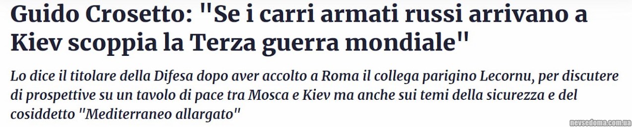 "Третья мировая война может начаться, если российские танки прибудут в Киев и на границы Европы. Не разрешить им приехать - это единственный способ остановить это", - отметил (https://www.rainews.it/articoli/2023/01/incontro-roma-crosetto-lecornu-ucraina-mediterraneo-965688c3-4ae5-4399-b2b9-1cf021474977.html) Крозетто.