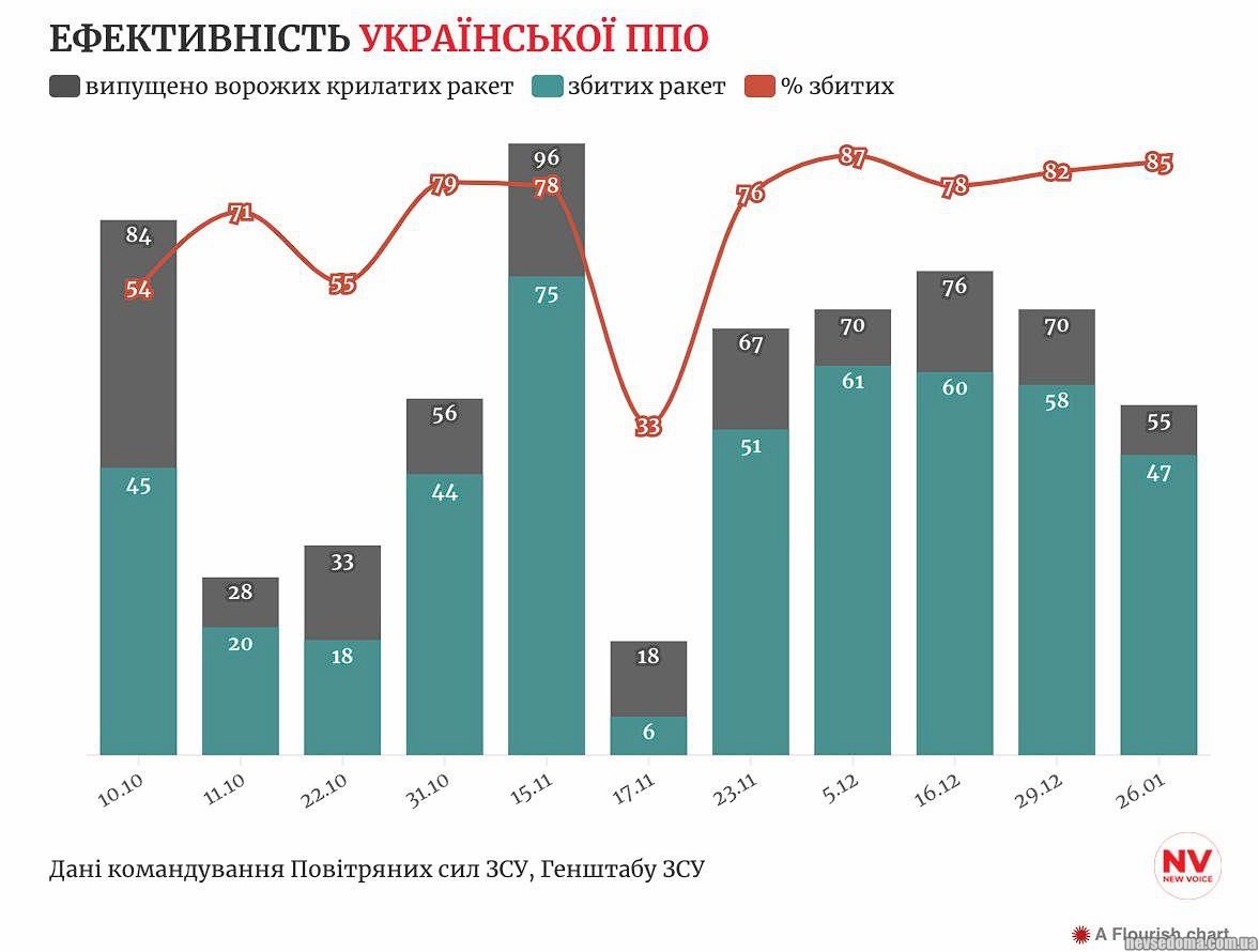 Появилась инфографика (https://nv.ua/amp/raketnyy-udar-26-yanvarya-kogda-budet-sleduyushchiy-novosti-ukrainy-50300356.html), из которой видно, что эффективность украинской ПВО составляет более 80%.