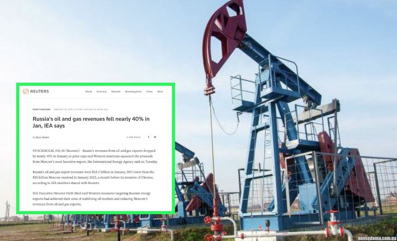 - Санкции не работают? Доходы России от экспорта нефти и газа в январе упали почти на 40% по сравнению с прошлым годом, — Reuters.