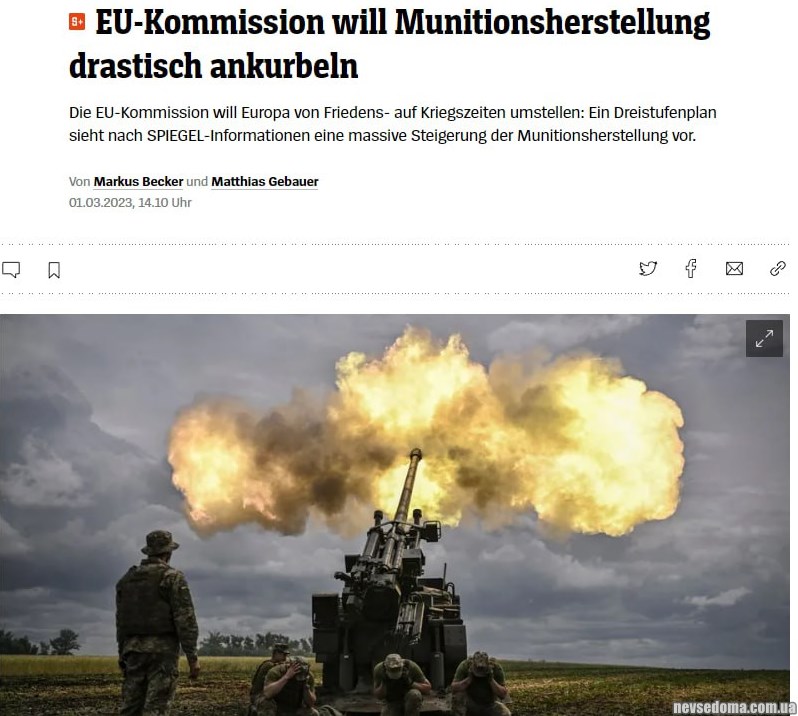 Еврокомиссия хочет (https://www.spiegel.de/politik/drei-stufen-plan-eu-kommission-will-munitionsherstellung-drastisch-ankurbeln-a-a3bcbd19-4680-4b63-910e-fc75c93c5f4f) перевести Европу из мирного времени в военное: созданный ЕК трехэтапный план предусматривает массовое увеличение производства боеприпасов.