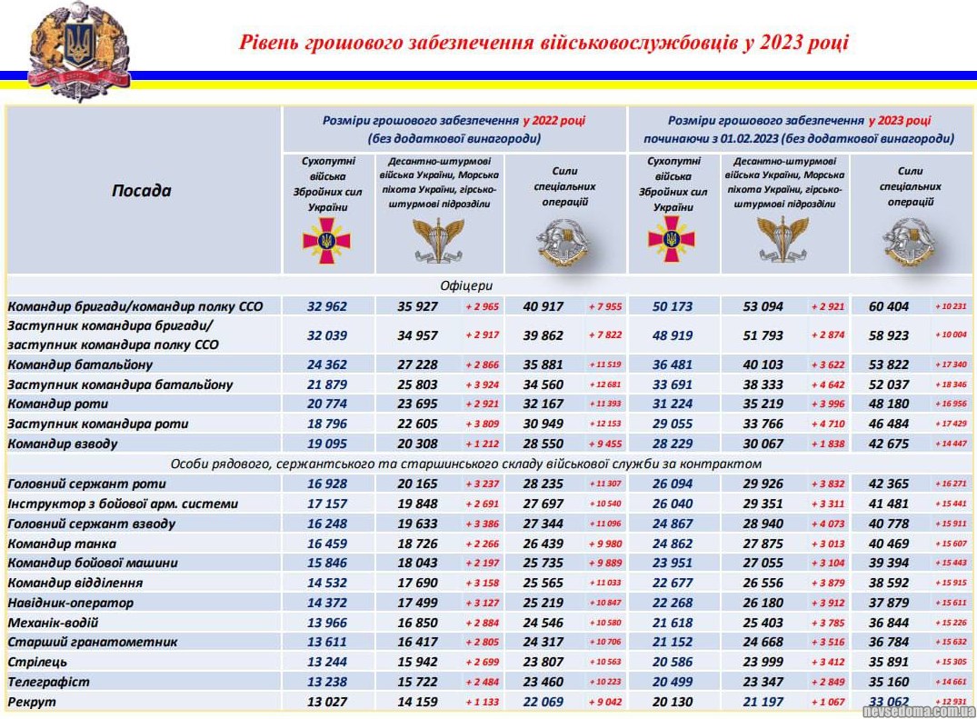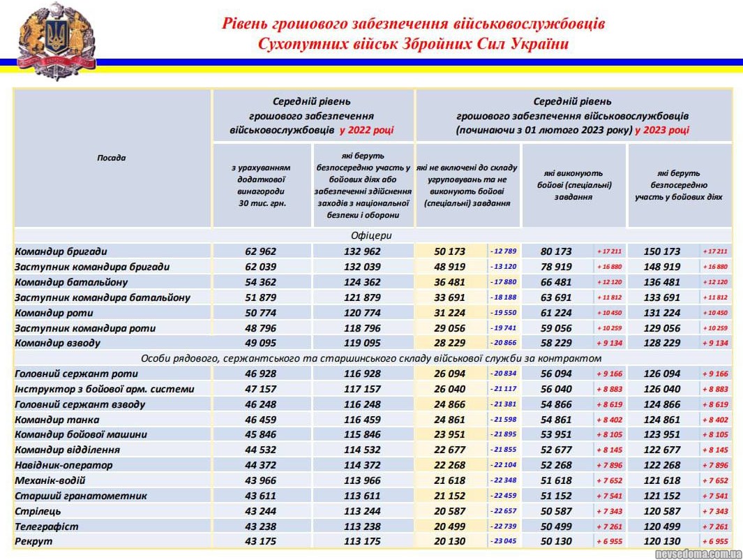 Например, стрелок в Сухопутных войсках получал (https://news.liga.net/politics/news/zarplaty-voennyh-v-2023-godu-kto-i-skolko-poluchit-tablitsa-ot-minoborony) в прошлом году в тылу немногим больше 40 000 грн, если непосредственно был задействован в боевых действиях – 113 000 грн, то в марте 2023 года такой военнослужащий получит: