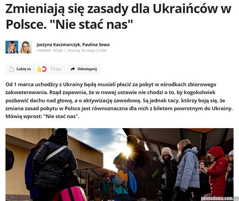 - Украинских беженцев в Польше обязали с марта платить за размещение в центрах проживания, — Interia.