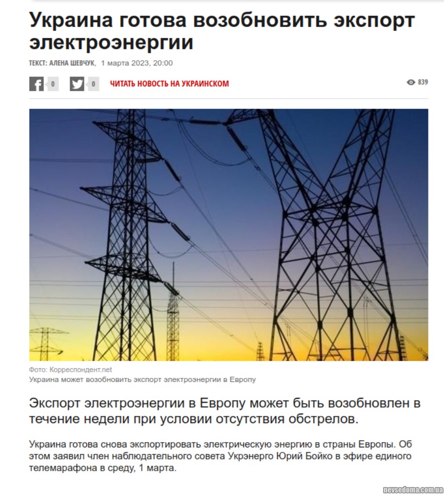 - Хорошая новость ! Энергосистема Украины пережила зиму, внутренним потребителям снова хватает, а излишки скоро будем продавать. Планы кремлевских людоедов не сбылись