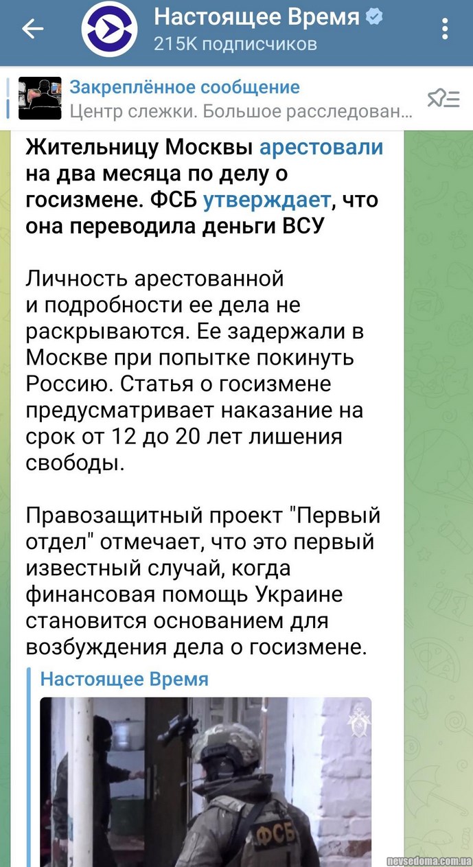 - Жительницу Москвы арестовали на два месяца по делу о госизмене. ФСБ утверждает, что она переводила деньги ВСУ. Статья о госизмене предусматривает наказание на срок от 12 до 20 лет лишения свободы. "Настоящее время".