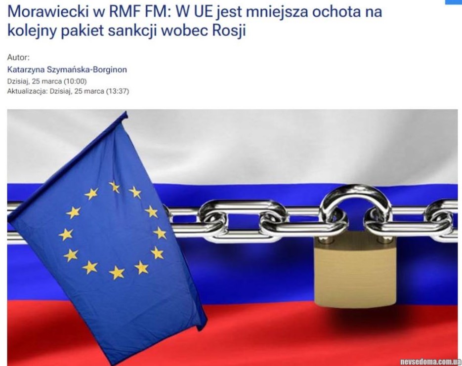 Моравецкий отметил, (https://www.rmf24.pl/fakty/polska/news-morawiecki-w-rmf-fm-w-ue-jest-mniejsza-ochota-na-kolejny-pak,nId,6675954#crp_state=1) что Варшава постоянно указывает ЕС на пути обхода санкций, выступая инициатором новых пакетов. Он выразил надежду на то, что в ближайшее время санкционная тема вернется на стол переговоров в Евросоюз.