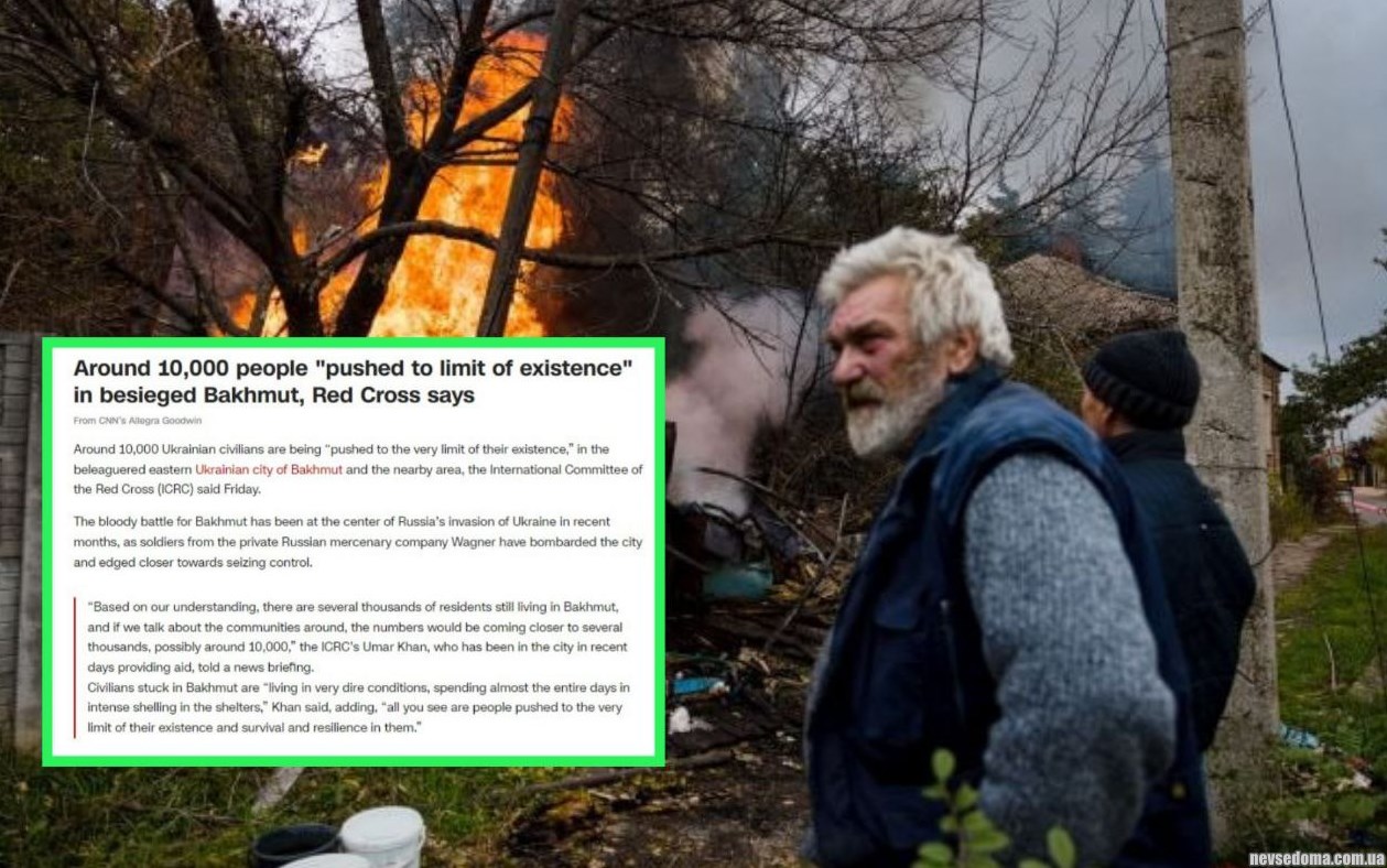 "Около 10 тысяч мирных жителей Украины цепляются (https://edition.cnn.com/europe/live-news/russia-ukraine-war-news-03-25-23/h_6fc158a17f51270b0d42f942a07e1bae) за жизнь в Бахмуте. Они живут в очень ужасных условиях, проводя почти целые дни под интенсивным обстрелом в укрытиях", — сообщил представитель Красного Креста Умар Хан.