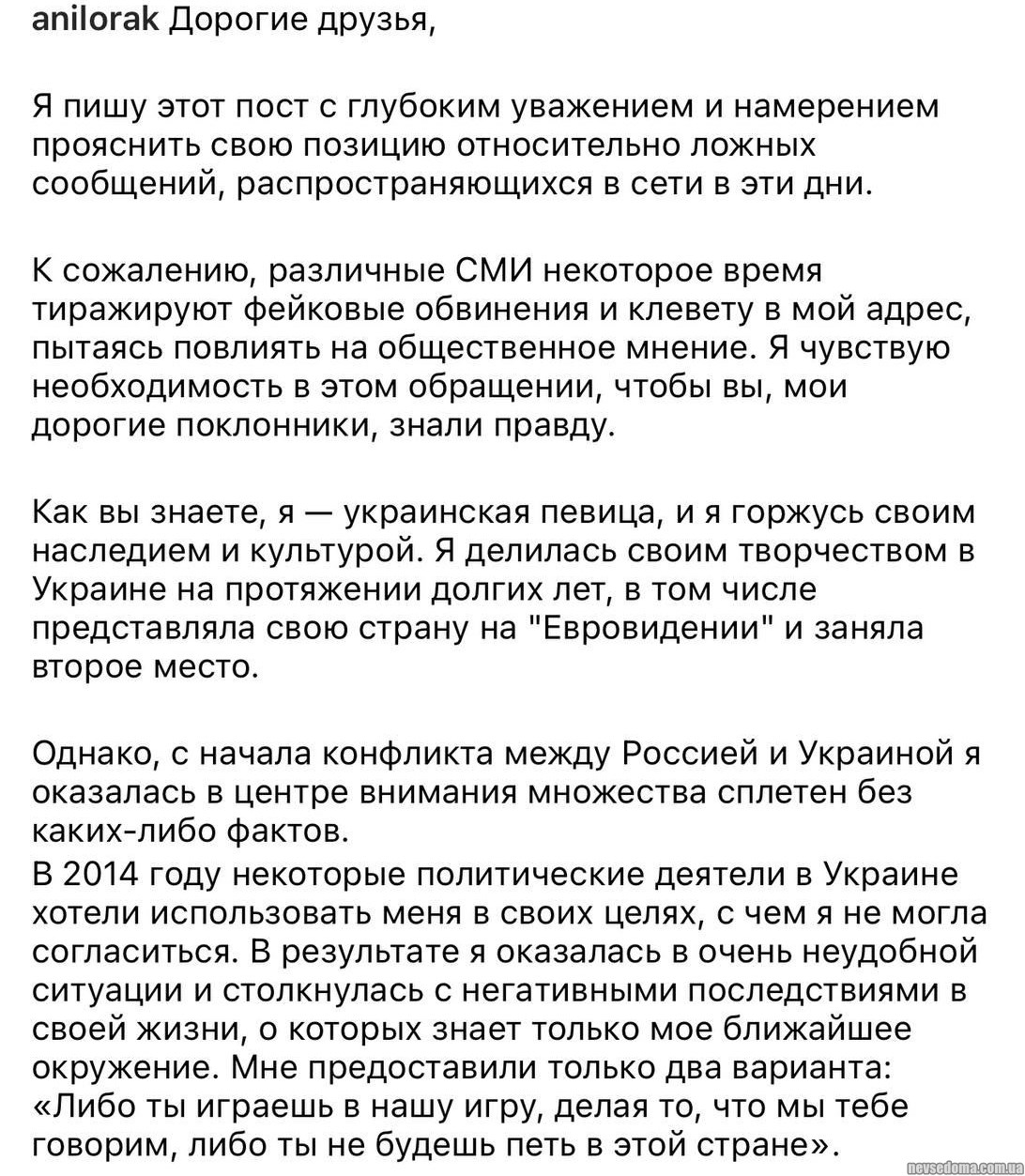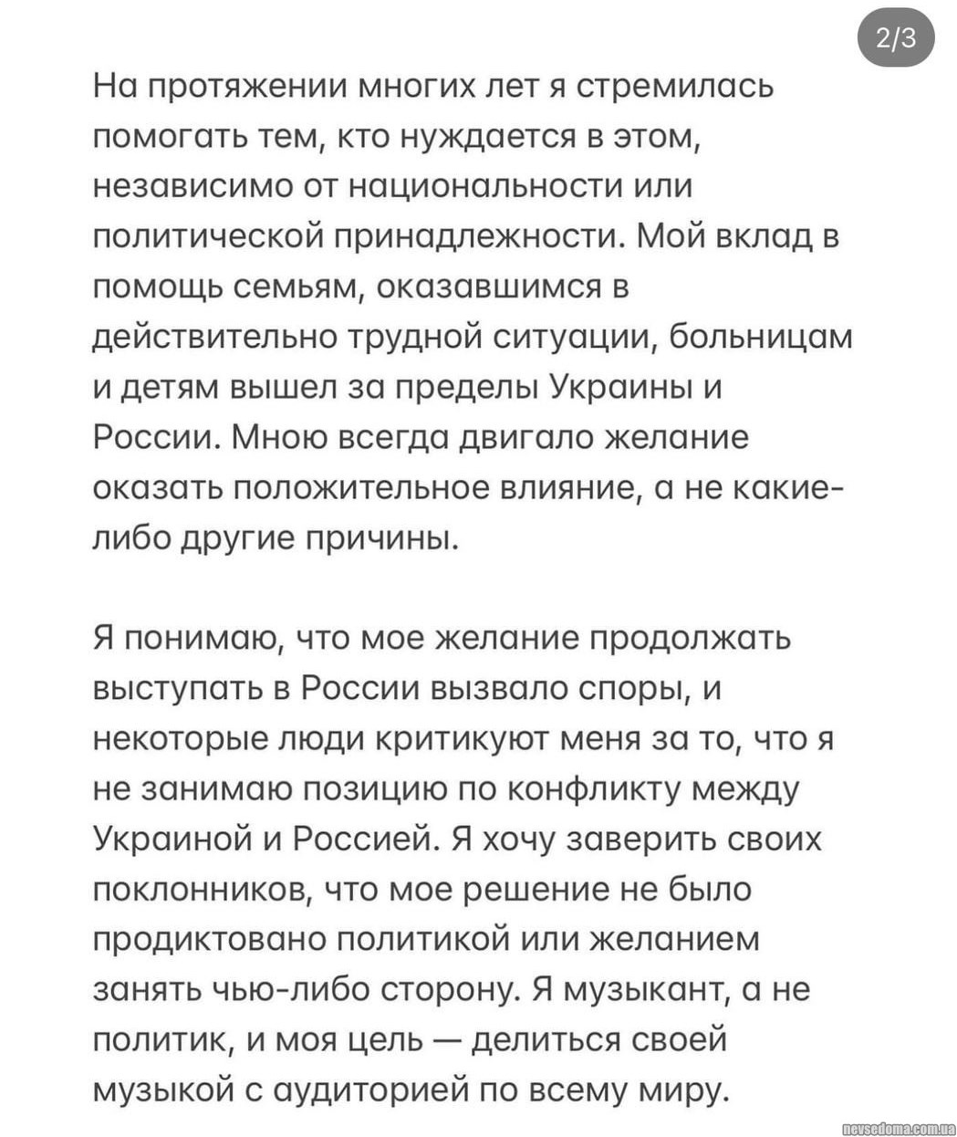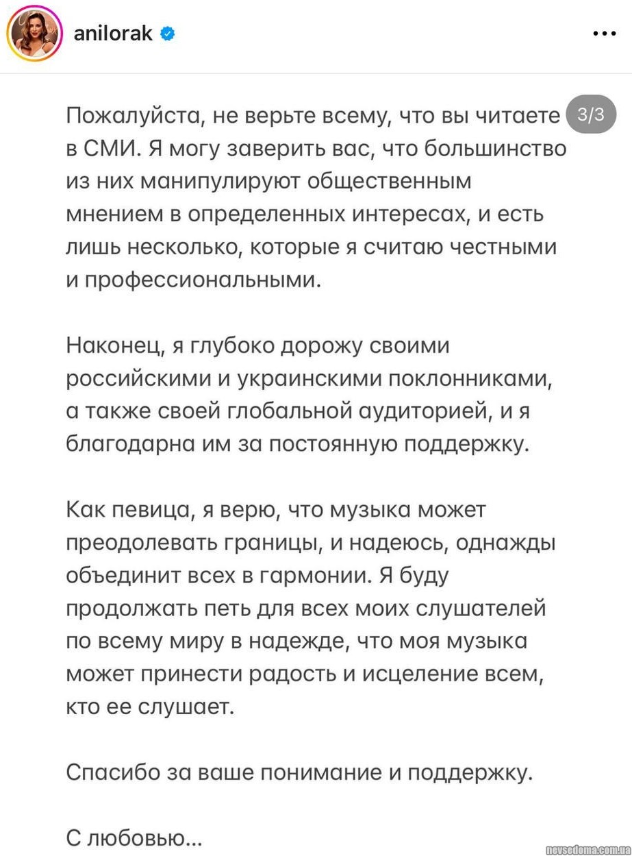Певица прокомментировала свою позицию в «конфликте между Украиной и Россией», а также свое «оказание военной помощи ВСУ», в котором ее обвинил мэр Краснодара, отменив ее концерт в городе.