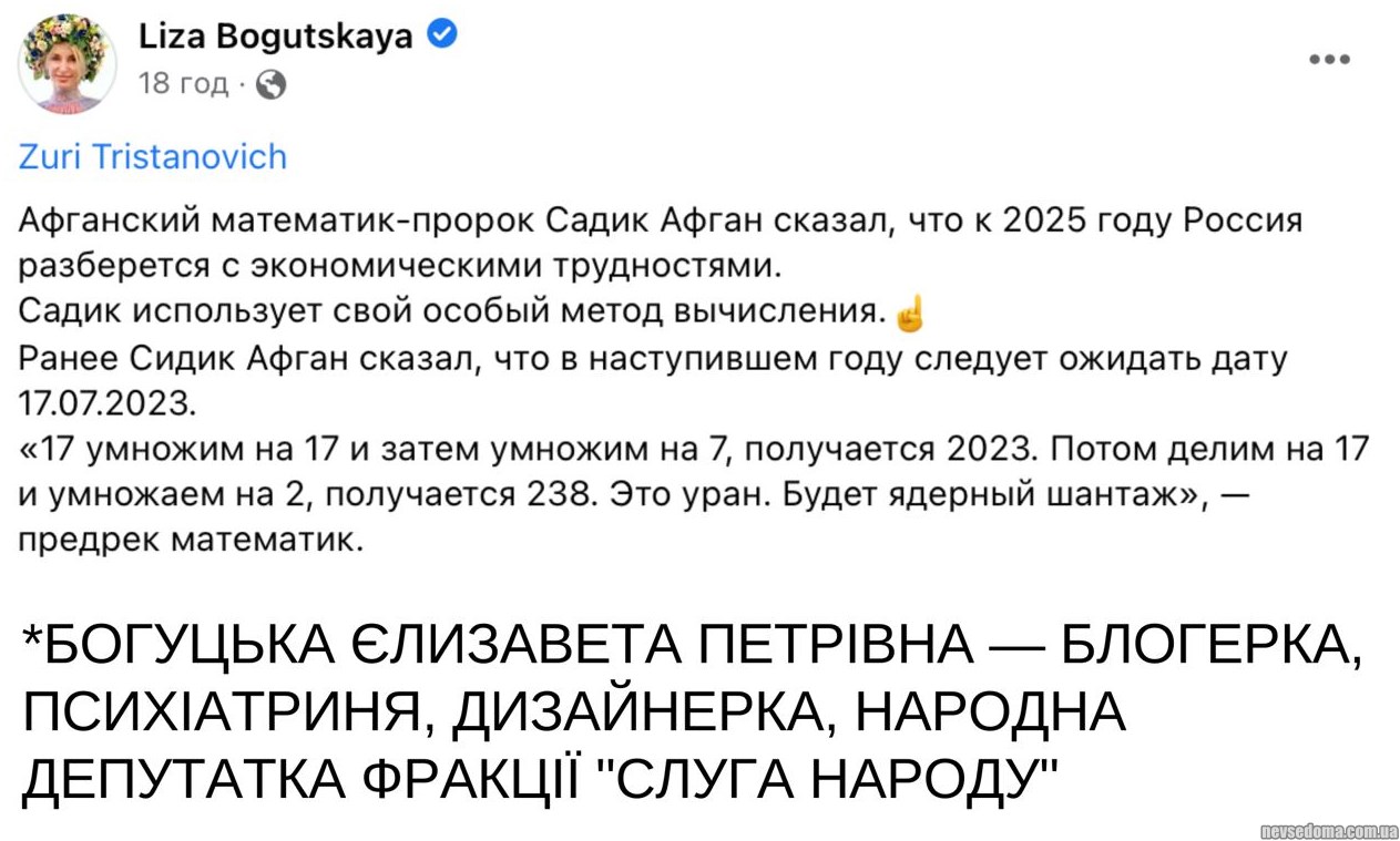 - Афганский пророк сказал, что к 2025 году Россия разберетcя с экономическими трудностями, — нардепка Елизавета Богуцкая.