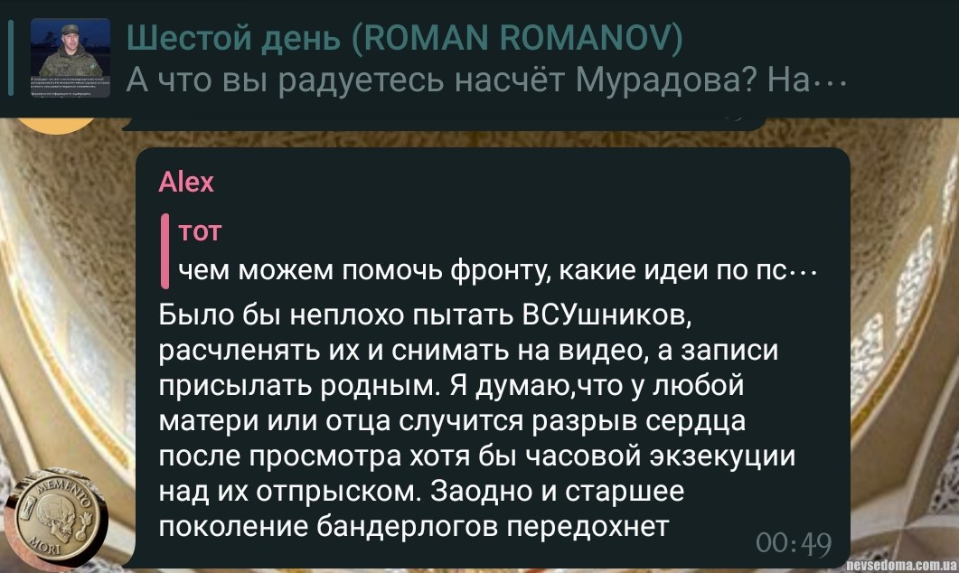 И.П. "Нас отъебут, блядь. У нас вариантов никаких, блядь. Даже если он [Путин] отъебёт и нажмёт на кнопку, блядь, будущего в этом раскладе у целой нации нихуя нет. Он нас всех выебал в рот, блядь".