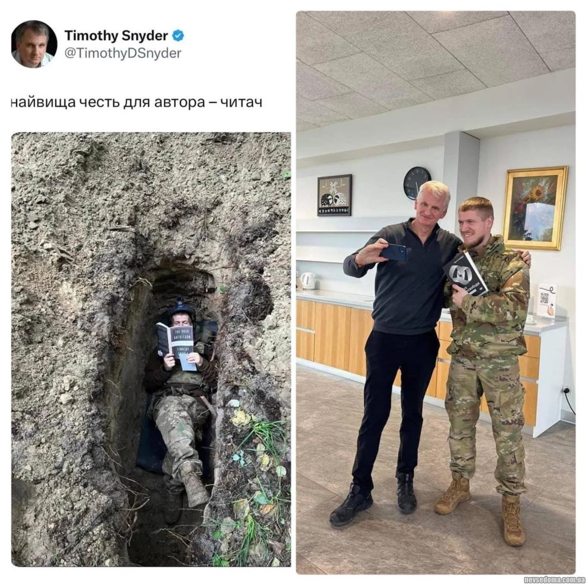 - Писатель Тимоти Снайдер опубликовал фотографию солдата ВСУ - Александра Ширшина в окопах со своей книгой. Он тогда написал, что «высшая честь автора - читатель». Им удалось встретиться и сделать совместное селфи.