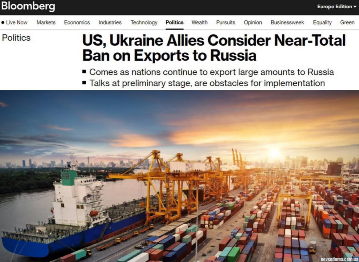 - США и другие страны-союзницы Украины рассматривают возможность введения почти полного запрета на экспорт в РФ, — Bloomberg.