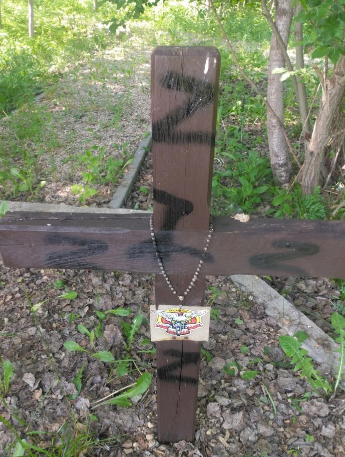 Фотографии накануне опубликованы во «ВКонтакте» очевидцем. На памятный знак и крест краской нанесены литеры Z, а на постаменте у креста оставлено оскорбление.