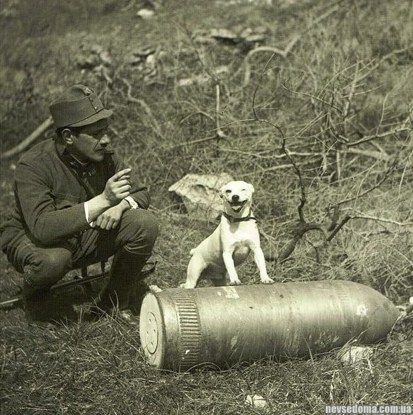 - Солдат Австро-венгерской армии с собакой и итальянским снарядом в горах Монте-Брионе, 1916 год.