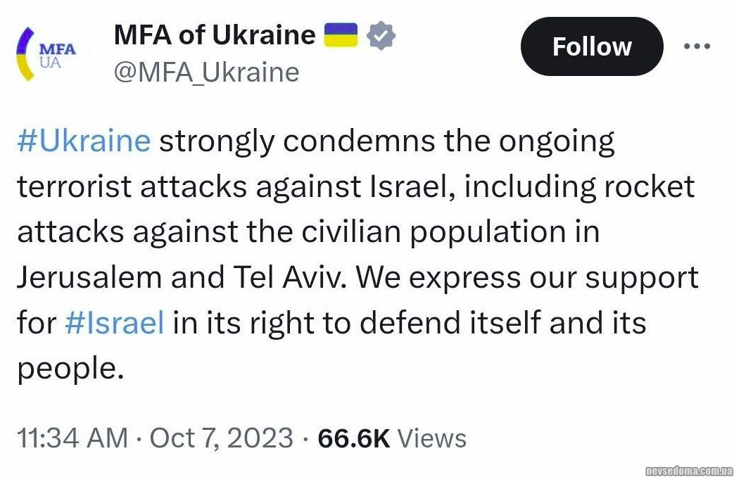 - МИД Украины осудил террористические атаки против Израиля, выразил поддержку Израилю и его народу и признал его право на самооборону.