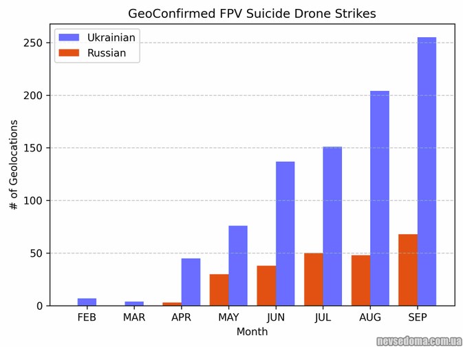 - Карта подтвержденных геолокацией атак беспилотников россиян и украинцев.