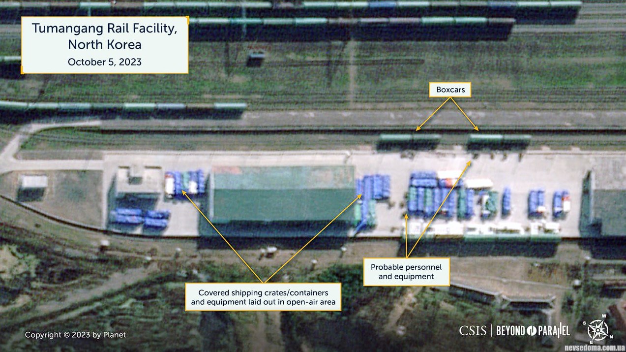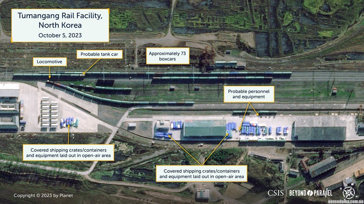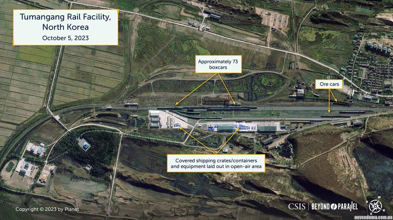 Спутниковый снимок железнодорожного объекта в северокорейском городе Туманган, на границе с Россией, от 5 октября 2023 года зафиксировал беспрецедентное количество грузовых вагонов - всего около 73.