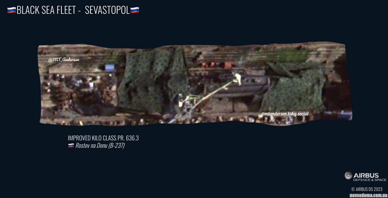 Подводная лодка "Ростов-на-Дону", получившая два тяжелых повреждения, частично закрыта маскировочными сетками от любопытных глаз наблюдателей и объектива западных спутников.